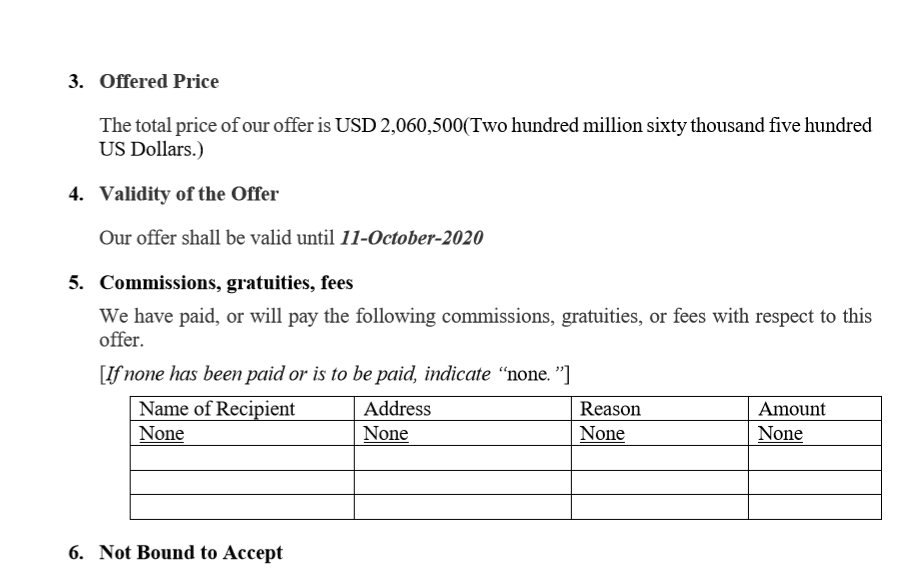 There is inconsistency between Item 3. Offered Price ($2 600 500.00 ) and Price Schedule N1 and N4. ($2 068 520.00).