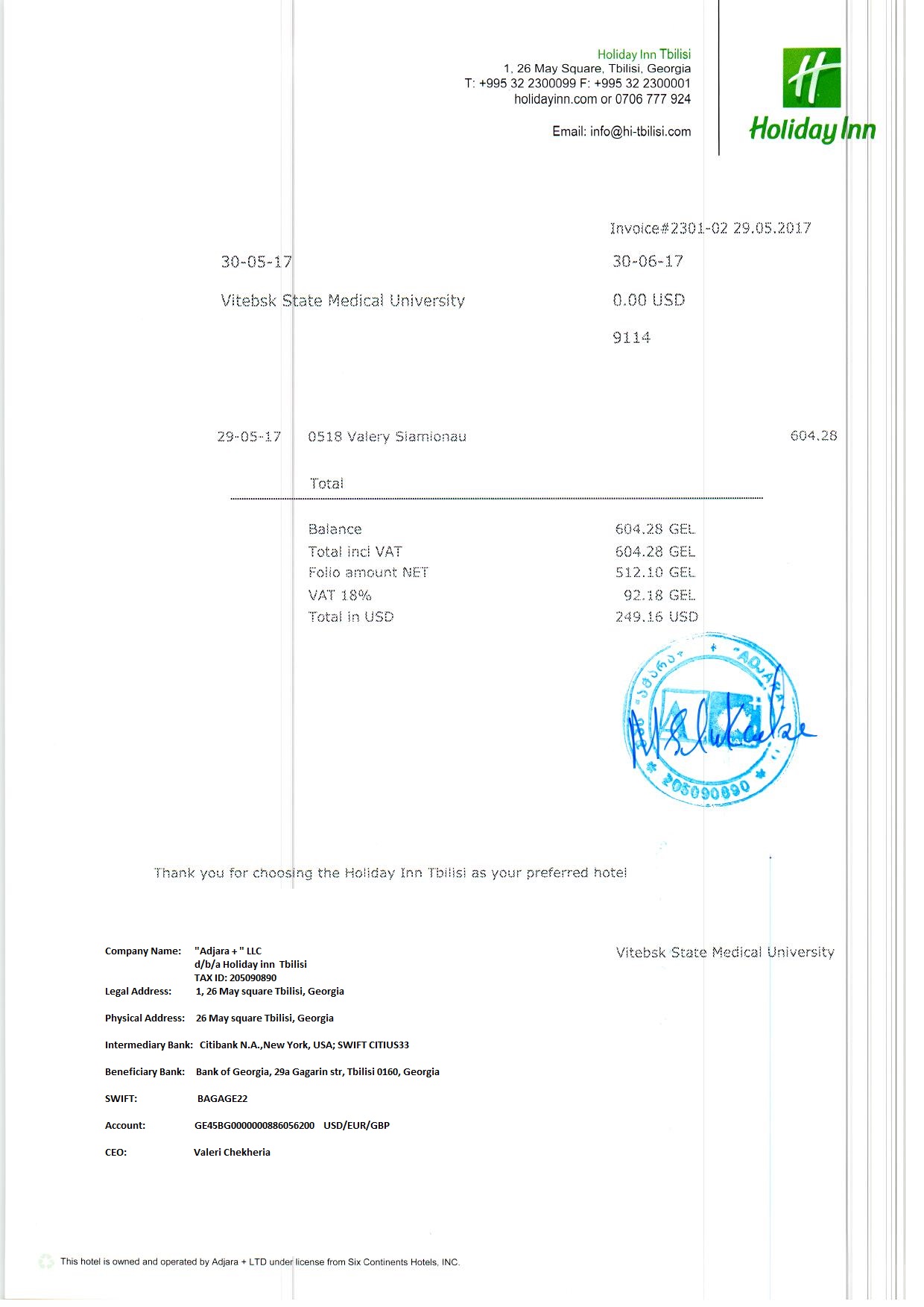 დიდი მადლობა თანამშრომლობისათვის, როგორც შევთანხმდით ერთკაციანი სტანდარტული ნომრის ორი ღამის ფასი იქნება ( 125USD +125USD =250USD) 18%დღგ- სა და საუზმის ჩათვლით),