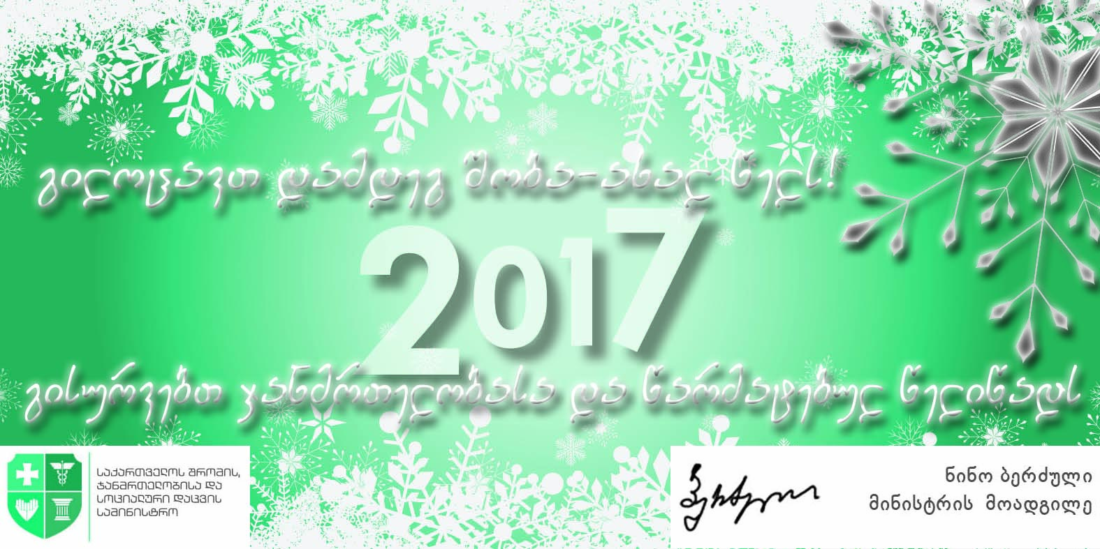 მინდა დიდი მადლობა მოგიხადოთ 2016 წლის ნაყოფიერი თანამშრომლობისათვის და მოგილოცოთ დამდეგი 2017 წელი! გისურვებთ ჯანმრთელობას, სიხარულს, ბედნიერებას და რაც მთავარია მშვიდობას თქვენს ოჯახებსა და სრულიად საქართველოში!
