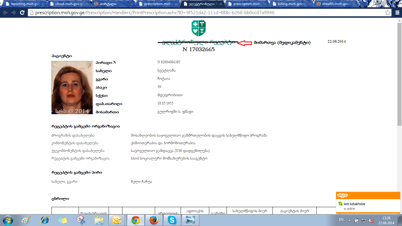 ძებნის მაგივრად - მიმართვის (მედიკამენტი) ძებნა. მიმართვის ამობეჭდვისას ელექტრონული