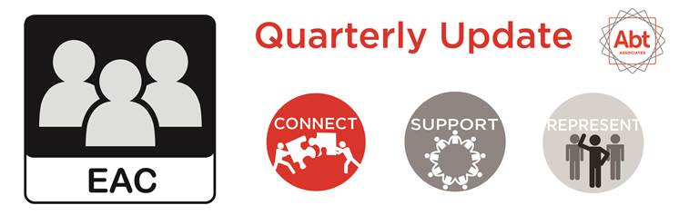 | The EAC welcomes new members from Cambridge, Bethesda and JordanIn December, the EAC welcomed four new representatives who will serve three-year terms. Scott Giarla, from the IT Department, is the newly-elected representative from Cambridge. Krista Pages from Contract Operations and Maria Claudia De Valdenebro from Corporate Communications are the newly-elected representatives from Bethesda. Sharaf Darwish will represent Abt staff from Asia/Europe/Near East/Jordan. You can find contact information for your representatives below or on the EAC’s AGI page. EAC Annual MeetingOn January 12-14 the EAC held its annual meeting in Bethesda. This is the only time of year when all the EAC representatives from across the Company meet together in person to review results of the annual survey and use those results to develop our 2015 work plan. The finalized 2015 work plan can be found on the EAC’s AGI page. EAC Pilot Testing Expanding to Abt SRBIIn the spirit of One Global Abt, the EAC is currently pilot testing expanding into Abt’s wholly owned subsidiaries, Abt SRBI and Abt JTA. Ken Gaalswyk was selected as the SRBI liaison to the EAC for the 2015 calendar year. His participation and insight will provide critical feedback on how the EAC can best represent all employees across Abt Associates. | ||