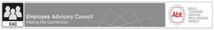 We encourage you to attend one of Kathleen’s CEO Breakfasts, a forum for conversation about change at Abt—past and future. Email the EAC with questions that you have for Kathleen around this topic. They will be passed to Kathleen anonymously.