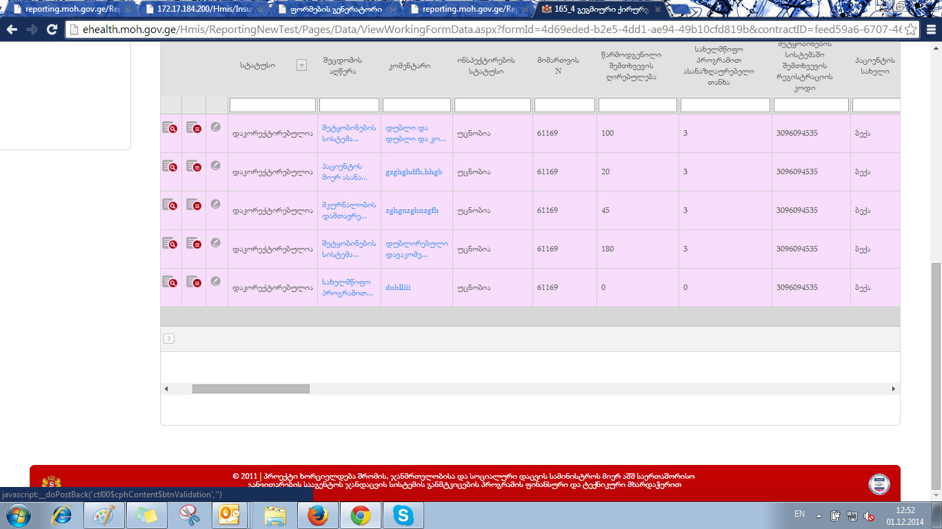სატესტო ვერსია ისევ არ მუშაობს (როდესაც ვირჩევ ფორმას მაგ: 36_4 მტოვებს ისევ იგივე გვერდზე), გამომდინარე აქედან ისევ ვერ ვახერხებ გატესტვას, თუ გავითვალისწინებთ იმას, რომ 01.12.2014-ში უნდა ჩავრთოთ ანგარიშგებაში გადაგზავნა და თუ იმასაც გავითვალისწინებთ, რომ დღეს 28 რიცხვია და პირველამდე დარჩა მხოლოდ არასამუშაო დღეები, მოგვიწევს ბანერის დადება.