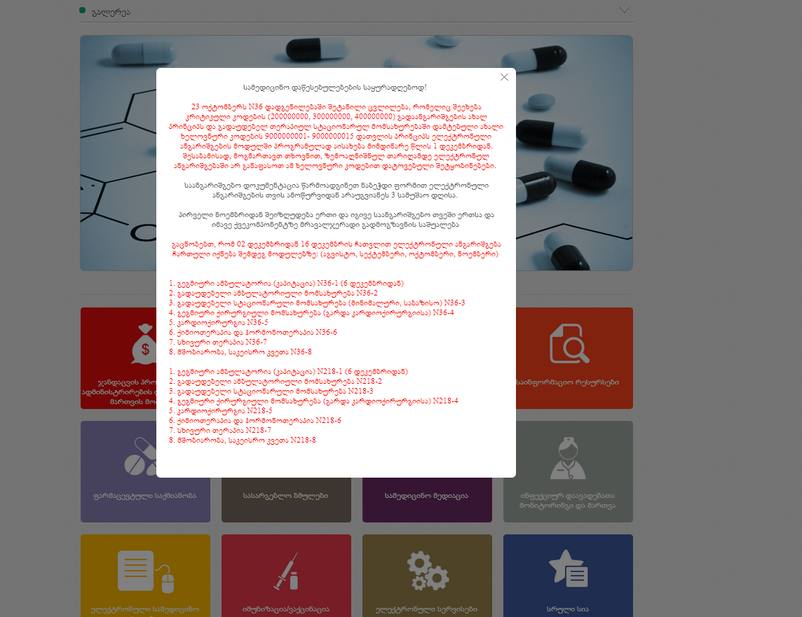 02.12.2013-დან 16.12.2013-ის ჩათვლით უნდა ჩავრთოთ ელექტრონული ანგარიშგების მოდული (ანუ კლინიკებს უნდა ჰქონდეთ გადაგზავნის საშუალება), ყველა ფორმაზე გარდა: