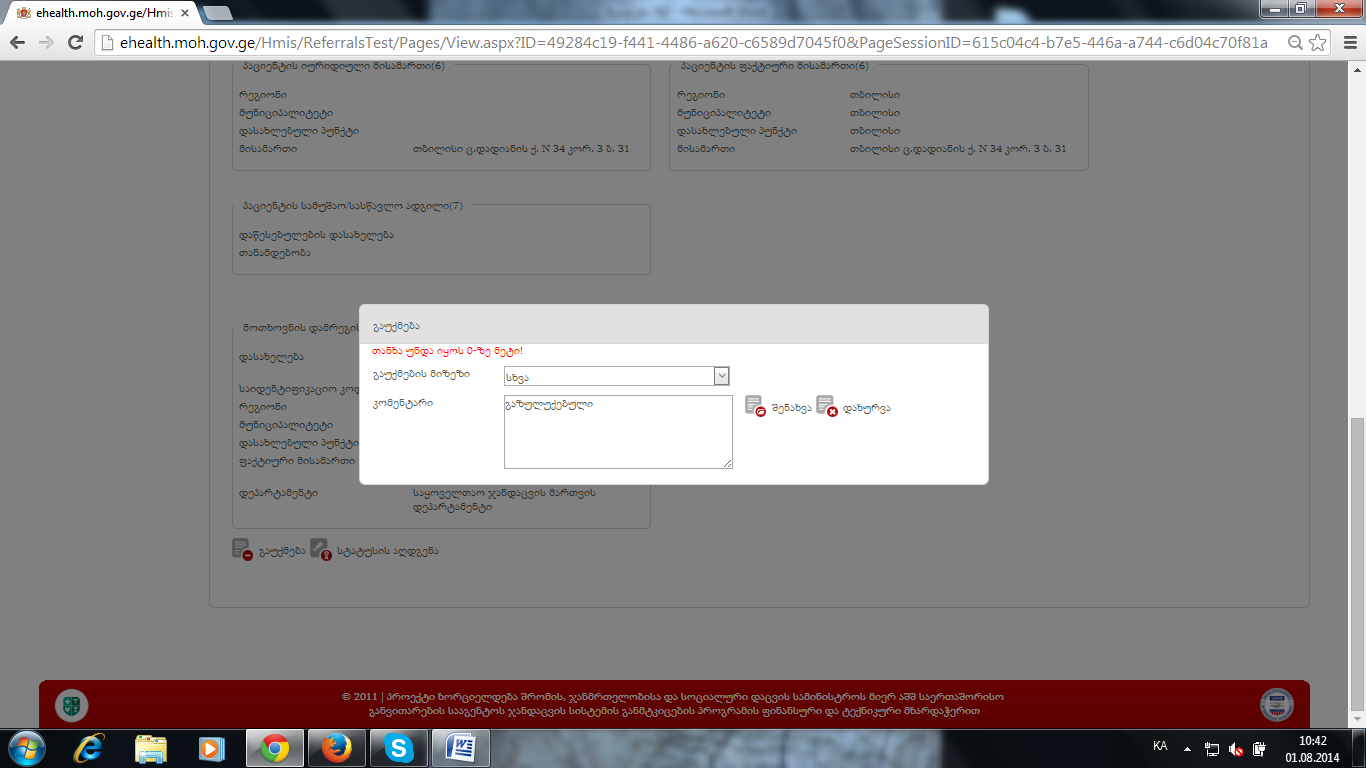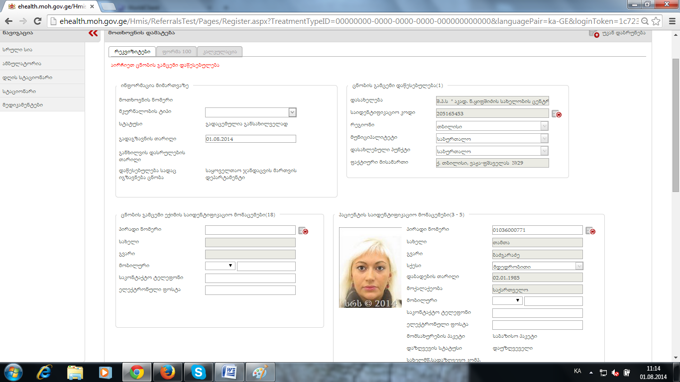 ანუ შევ� �ვსე რეკვიზიტების გვერდი და გადავედი ფორმა100- ზე, დაიგნოზების და ჩარევების დამატების დროს შევამჩნიე რომ არ ემატებოდა, ჩავხურე ფანჯარა და გამოვიდა მესიჯი- იხილეთ ბმული 1, შემდეგ ისევ თავიდან ვცადე მაგრამ საერთოდ არ იმატებს- ბმული 2.