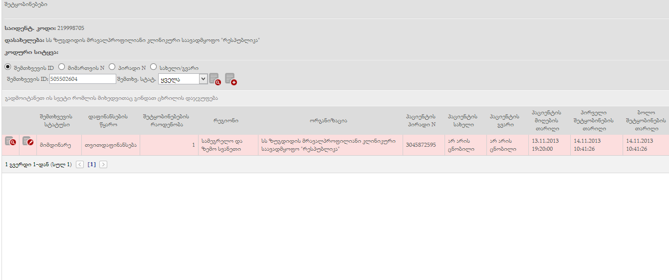 ზურა გამარჯობა, ზუგდიდის მრავალპროფილიანი კლინიკური საავადმყოფო "რესპუბლიკას" ს/კ 219998705 შემთხვევა დატოვებული აქვს უცნობით შ/ნ 505502604, რომელსაც ვეღარ პოულობს, რადგან არ იძებნება, თუმცა როცა ჩემი უზერით შევდივარ მაშინ იძებნება. როგორც კლინიკა აცხადებს მსგავსი პრობლემა ექმნებათ როცა შემთხვევას ტოვებენ უცნობზე.