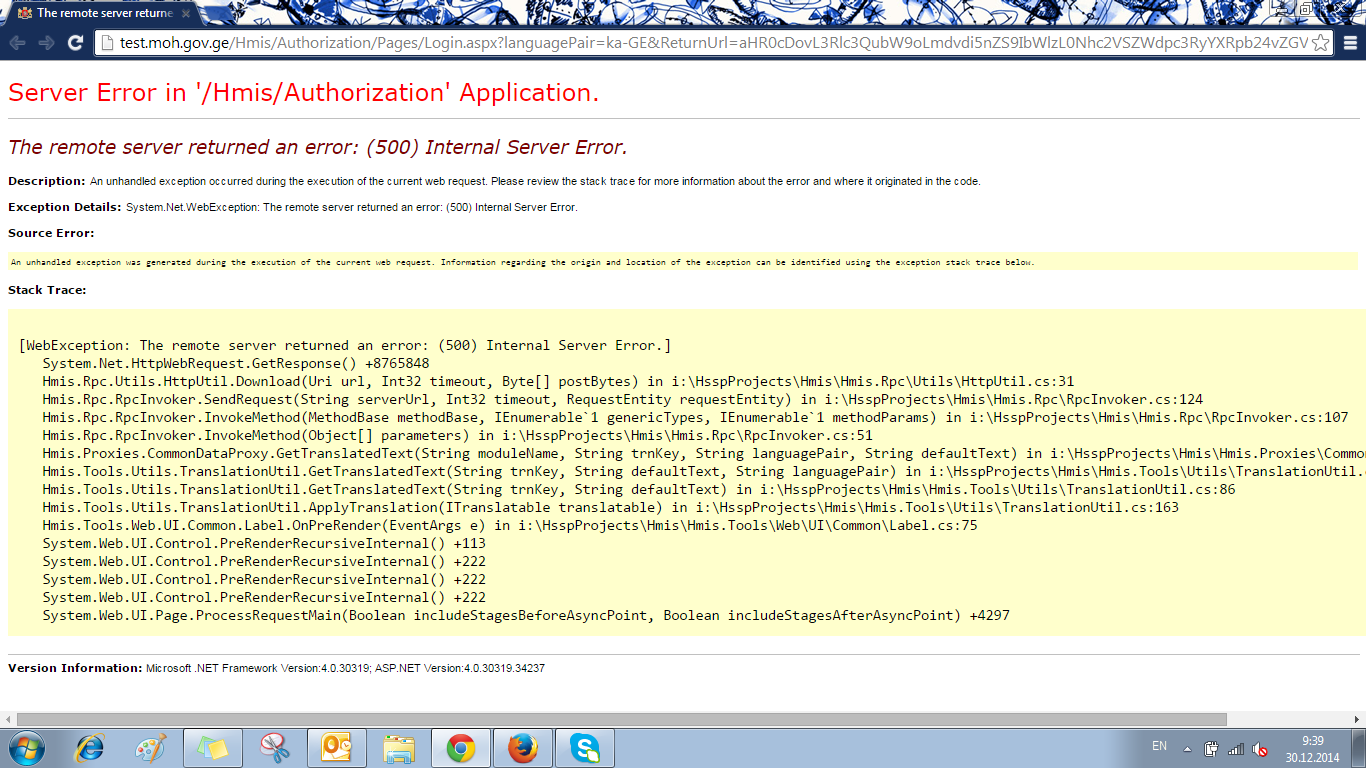 სატესტო ვერსიაზე ერორია, რის გამოც ვერ ვახერხებ გატესტვას. http://test.moh.gov.ge/Hmis/Authorization/Pages/Login.aspx?languagePair=ka-GE&ReturnUrl=aHR0cDovL3Rlc3QubW9oLmdvdi5nZS9IbWlzL0Nhc2VSZWdpc3RyYXRpb24vZGVmYXVsdC5hc3B4P2xhbmd1YWdlUGFpcj1rYS1HRQ2&__uthc=635555311747538618