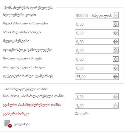 სამხედროს სტაციონარულ ფორმაზე კალკულაცია ხდება ფაქტიური ხარჯით და დანარჩენი ველები არ არის სავალდებულო