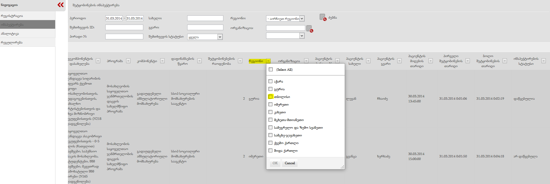რაც შეეხება რეგიონით ფილტრაციას, შემთხვევების პირდაპირ რეგიონით ფილტრაცია არ ხდებოდა (გარე სერვერზე არის ძველი ვერსია, სადაც რეგიონის მიხედვით იფილტრება მხოლოდ დაწესებულება), ახალ ვერსიაში (ინსპექტირება / ანალიტიკა) კი შესაძლებელია პირდაპირ გრიდის ნებისმიერი ველის მიხედვით ფილტრების / დაჯგუფების გამოყენება (40 000 მდე შემთხვევა 6-7 წამში ამოდის და შემდეგ ნებისმიერი ველით ფილტრაციას და დაჯგუფებას 1-2 წამი ჭირდება)