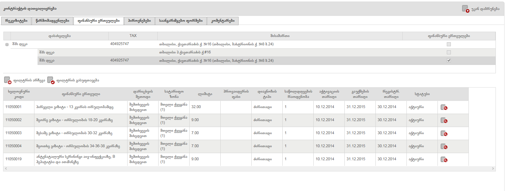 დაწესებულებას აქვს 2 ფილიალი, კონტრაქტი მიბმულია მომხმარებელზე მისამართით - 404925747 თბილისი, ქავთარაძის ქ. №16 (თბილისი, ბახტრიონის ქ. №8 ბ.24)