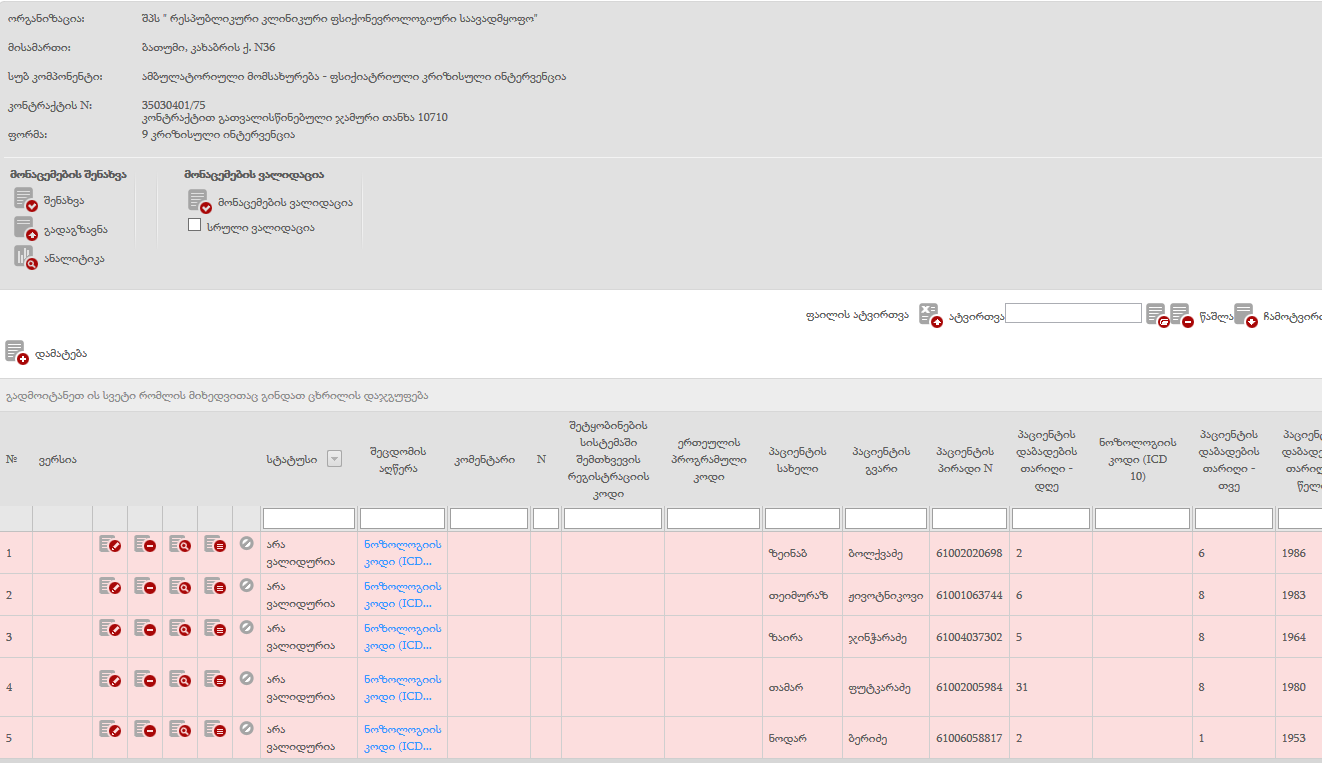 იმისთვის რომ ვალიდაცია გაიაროს ფორმამ საჭიროა მონაცემების შეყვანის დროს ფორმას დაემატოს ხელოვნური კოდი და ICD 10. რაც მოცემულ ფორმაზე დამატებული არ არის.