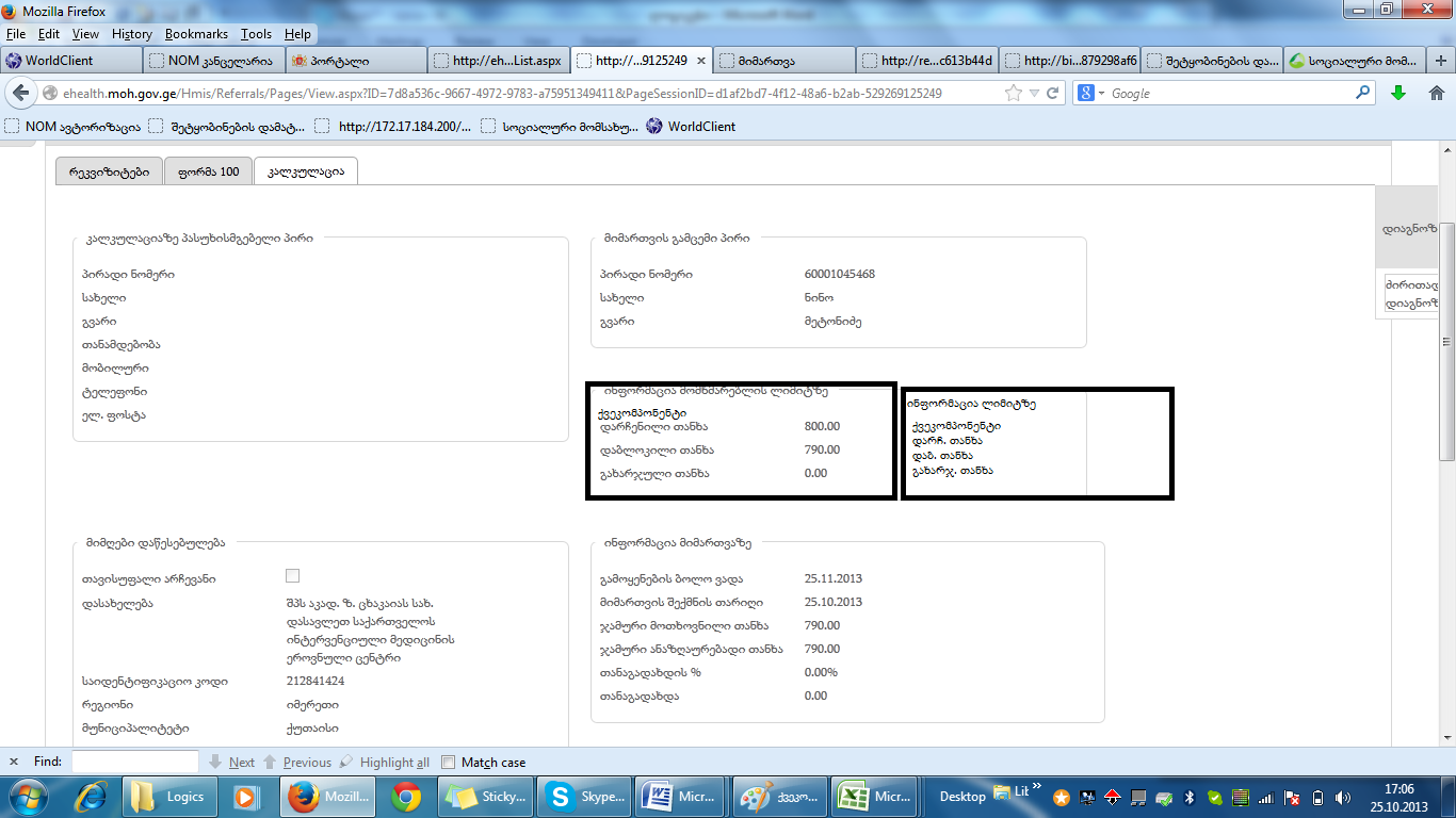 გიგზავნით თქვენს მიერ მოთხოვნილ ინფორმაციას, მიმართვის დარეგისტრირების გვერდზე არსებული tab-ების მიხედვით ( ფაილი "მიმართვებში ლოგიკები 25.10.2013"). მემგონი ყველა შეკითხვა ამოვწურეთ (ყოველ შემთხვევაში ძალიან ვეცადეთ).