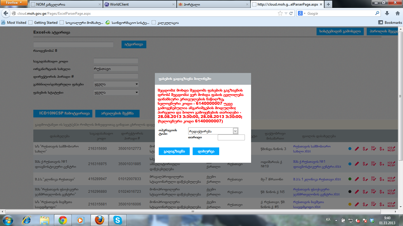 3.       და კლინიკა რუსთავი რომელზეც უკვე მრავალჯერ მოვიწერე. შეცდომა : მოხდა შეცდომა ფასების გაგზავნის დროს ! შეცდომა : ვერ მოხდა ფასის ცვლილება , ხელოვნური კოდი - 8000000000 უკვე გამოყენებულია ანგარიშგების მოდულში ; პირველი და ბოლო გამოყენების თარიღები - 27.09.2013 12:27:15, 27.09.2013 12:27:15; ( ხელოვნური კოდი 8000000000)- ეს კოდი განფასების გარეშე ჰქონდათ წამოღებული ანგარიშგებაში,მანჩო დაგვეხმარა და წაგვიშალა შემთხვევა სადაც ეს კოდი ფიქსირდებოდა,მიუხედავად ამისა იგივე ერორია.