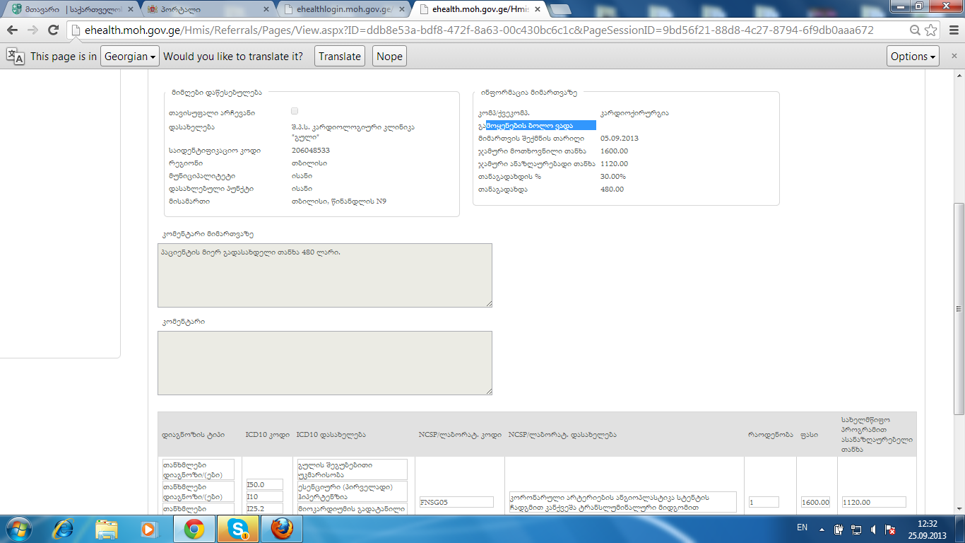 მოგესალმებით,გვიკავშირდება ქორიძის კლინიკა.მიმართვა გაცემულია, შეტყობინებას ვერ ხურავს კლინიკა და უწერს რომ მიმართვა არ არის გაცემულიო...სავარაუდოდ რაც მე ვნახე, ეს იმის ბრალია რომ მიმართვაზე არ არის მითითებული გამოყენების ბოლო ვადა ( წესით ამის საშუალებას არ უნდა აძლევდეს პროგრამა, გამოყენების ბოლო ვადის მითითების გარეშე მიმართვის ბეჭდვა არ უნდა ხდებოდეს)