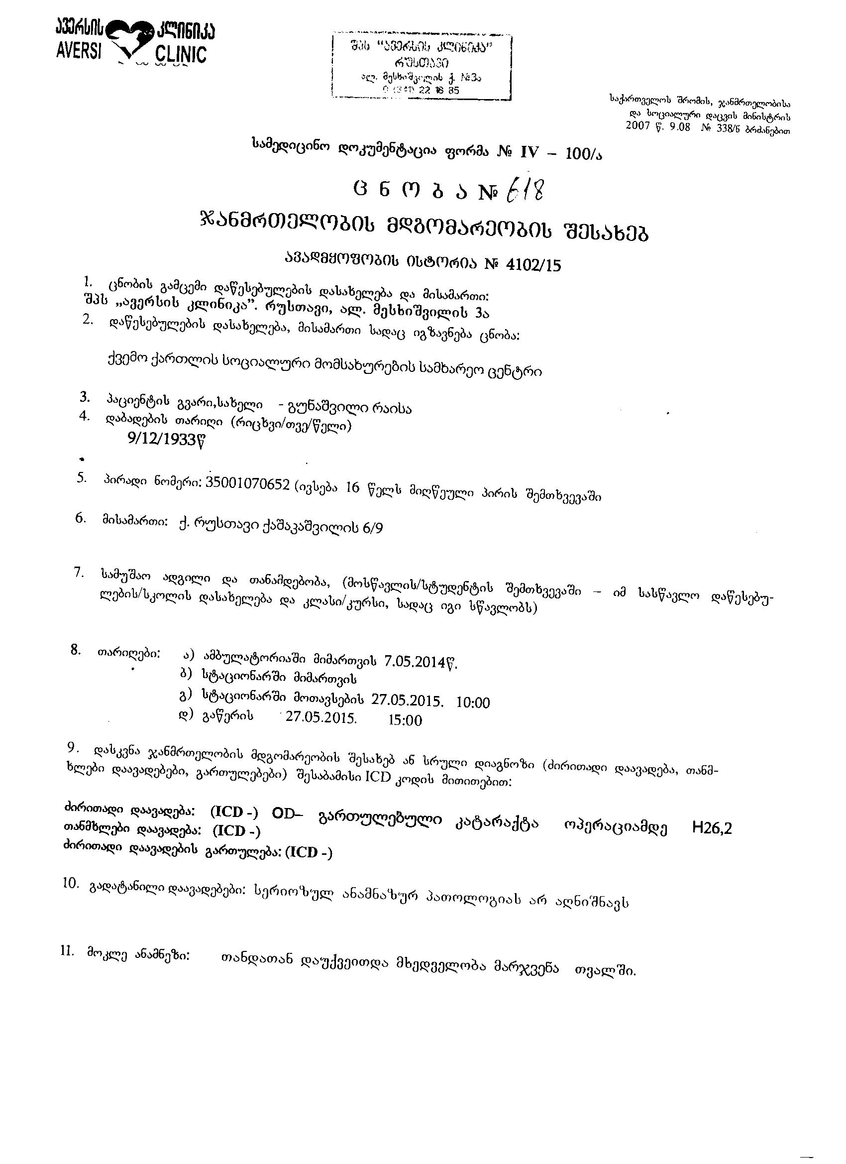 მიმდინარე წლის 26 ივნისს სამედიცინო პორტალზე გეგმიური ქირურგიული შემთხვევების ატვირთვისას პაციენტზე - გუნაშვილი რაისა, შემექმნა პრობლემა, კერძოდ დაჯამებისას მიწერს „მიმართვა გაცემულია სხვა ორგანიზაციაზე შპს „ჯ. გოგიაშვილის კლინიკა"“-ზე. საგარანტიო წერილი, მიმართვის #327874, გაცემულია შპს ავერსის კლინიკაზე, მის: რუსთავი, მესხიშვილი 3ა და წერილის შესაბამისად ოპერაცია გაკეთებულია აღნიშნულ კლინიკაში (იხ. დანართები).