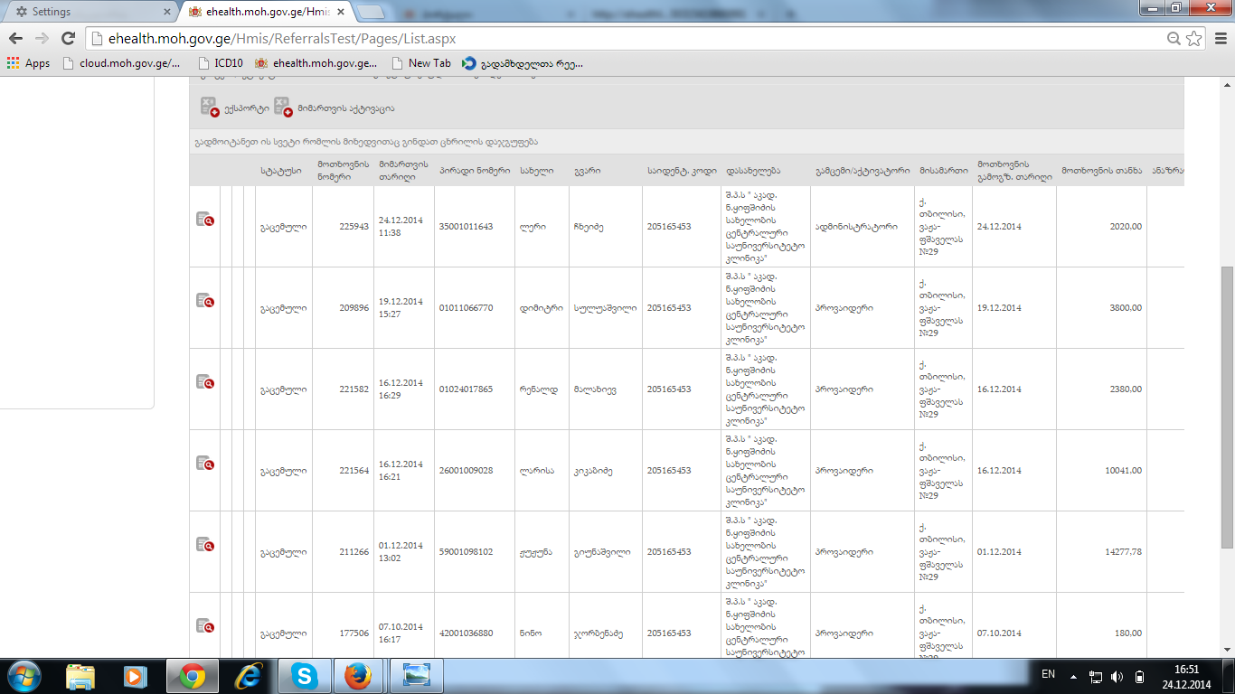 სხვათაორის მაგან მეც დამაეჭვა და მაგიტომ რამდენჯერმე ვცადე შესვლა ქეშის გაწმენდის შემდეგ. და თან საერთო სია გამოვიტანე და ყველა ყიფშიძის კლინიკაზე გაცემული მიმართვა მაჩვენა. და ზოგადად რომ ლოგ აუთის პრობლემა აქვს პროგრამას შენც კარგად ნახე როცა მანდ ვიყავი... საერთო სიას გავუკეთე სქრინშუთი და ნახე :) მაგიტომ დავეჭვდი.