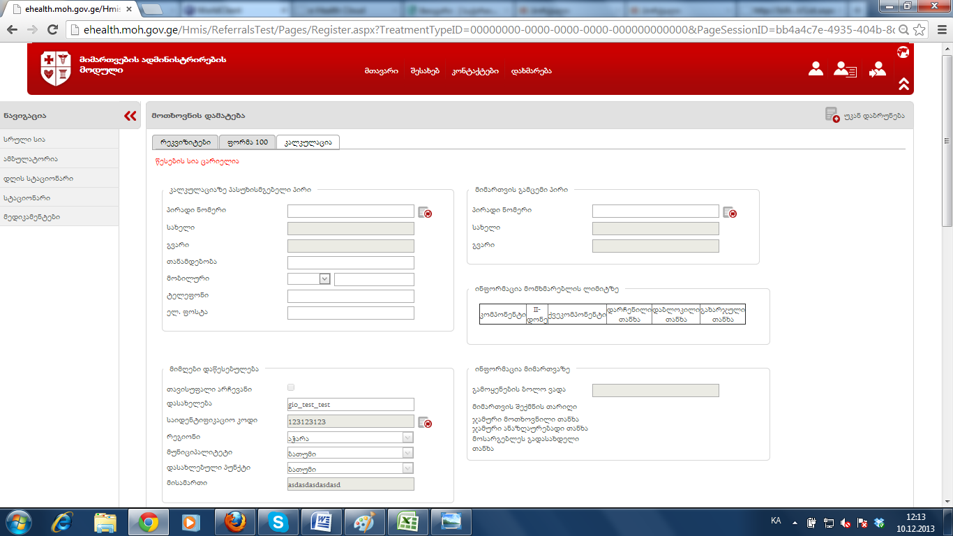 3. ფორმა 100 მითითებულია 2 ხელოვნური კოდი ბმული 9 და კალკულაციის გვერდზე ჩნდება 10. კლინიკა ყიფშიძე მაქვს მითითებული და კალკულაციის გევრდზე გადმოაქვს სატესტო კლინიკა. მოთხოვნა 177.