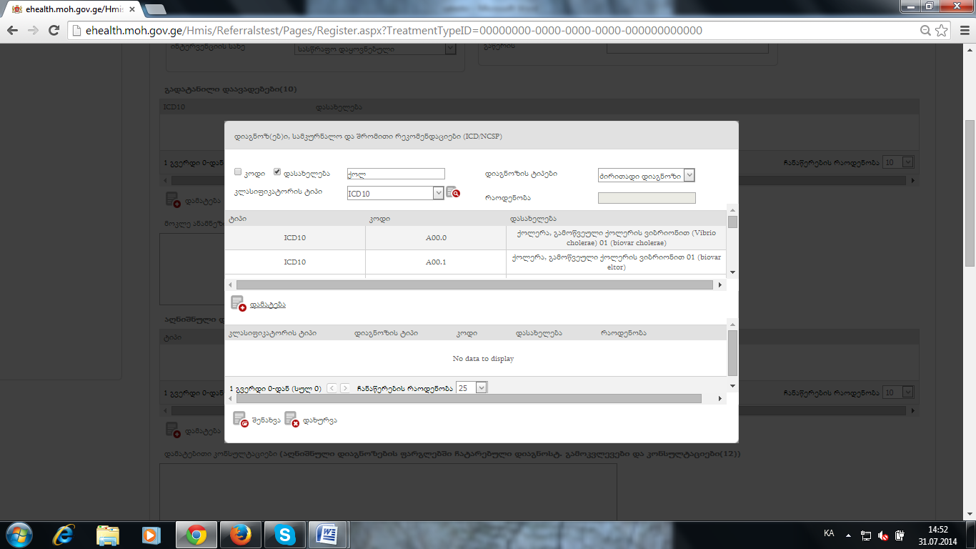 ანუ შევავსე რეკვიზიტების გვერდი და გადავედი ფორმა100-ზე, დაიგნოზების და ჩარევების დამატების დროს შევამჩნიე რომ არ ემატებოდა, ჩავხურე ფანჯარა და გამოვიდა მესიჯი-იხილეთ ბმული 1, შემდეგ ისევ თავიდან ვცადე მაგრამ საერთოდ არ იმატებს- ბმული 2.