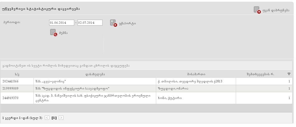 1.  facilities.jpg ფაილიდან ჩანს, რომ 200–ზე მეტი  დაწესებულებების გადმოგზავნილი ინფორმაციიდან  ივნისის განმავლობაში ცხრილში ნაჩვენებია მხოლოდ 3 დაწესებულება თითო შემთხვევით.