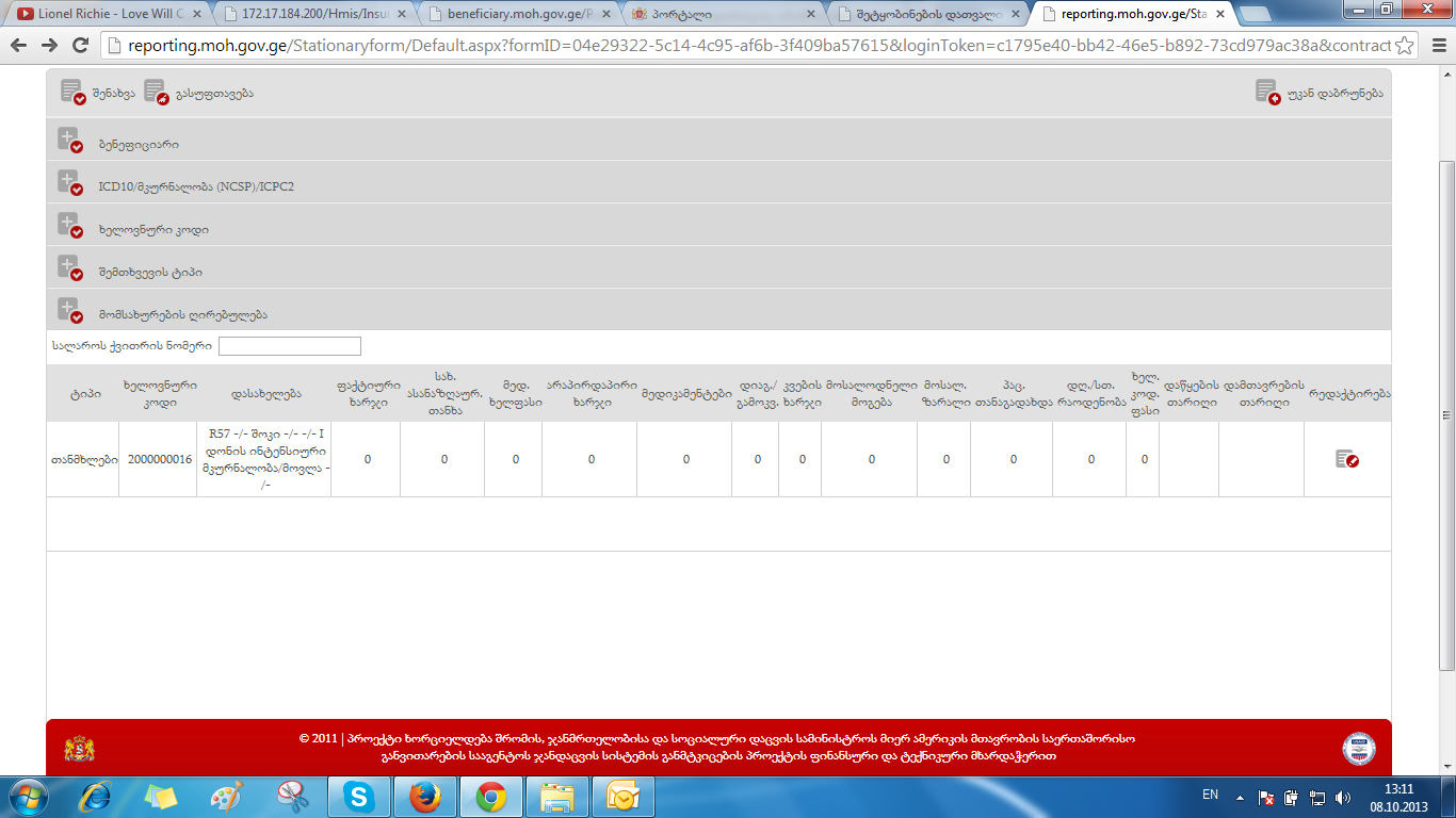 მითითებულია ძირითადი და თანმხლები დიაგნოზი ხელოვნური კოდებით. რეპორტინგში მომსახურების