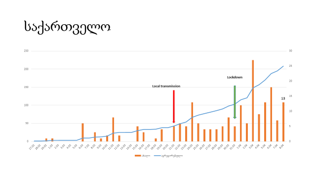 საქართველოში ამჟამად არის lockdown-დან მე-11 დღე (იხ. Figure 2), თუმცა მოწოდებული ინტერვენციები ეტაპობრივად წინ უსწრებდა აღნიშნულ ღონისძიებას, რაც დადებითად