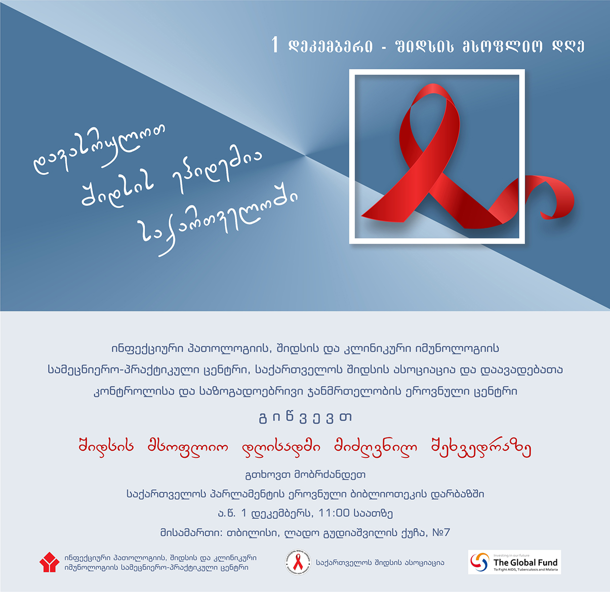 ინფექციური პათოლოგიის, შიდსის და კლინიკური იმუნოლოგიის ს/პ ცენტრი, საქართველოს შიდსის ასოციაცია და დაავადებათა კონტროლისა და საზოგადოებრივი ჯანმრთელობის ეროვნული ცენტრი გიწვევთ შიდსის მსოფლიო დღისადმი მიძღვნილ შეხვედრაზე.