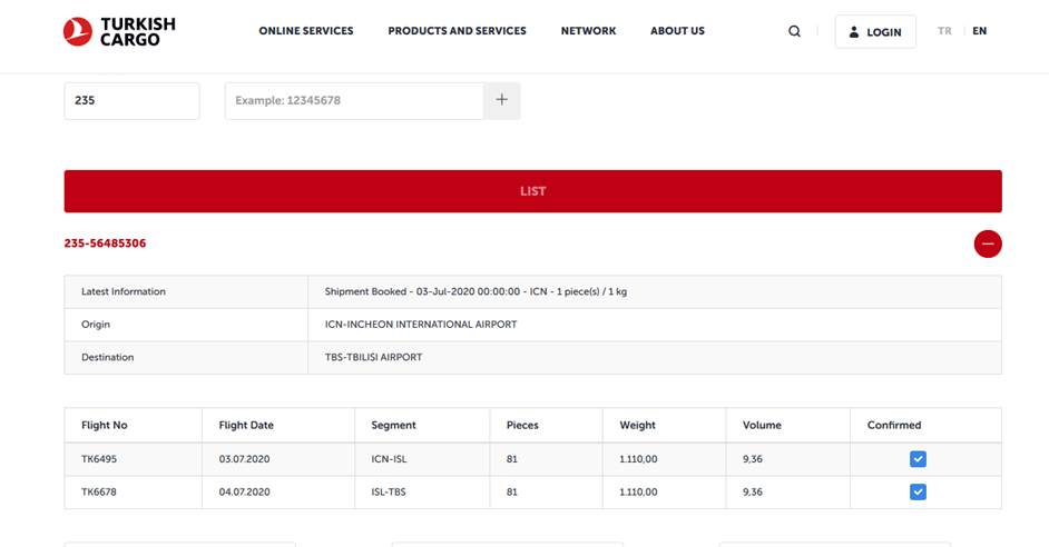გიგზავნით ავიაზედდებულს, ინვოისს და თრექინგს. თურქიშის საქართველოს ოფისს ვთხოვეთ და უკვე მიწერა სტამბოლში თავიანთ კოლეგებს რომ მიაქციონ ტვირთს ყურადღება და დანაწევრების გარეშე გამოაგზავნონ სტამბოლიდან. იმედია, სეულიდან დროულად შესრულდება რეისი და ჩვენი ტვირთიც ამ შაბათს ან მაქსიმუმ კვირას (წინა კვირაში შაბათის ნაცვლად სტამბოლიდან ფრენა კვირას შესრულდა) ჩამოვა.