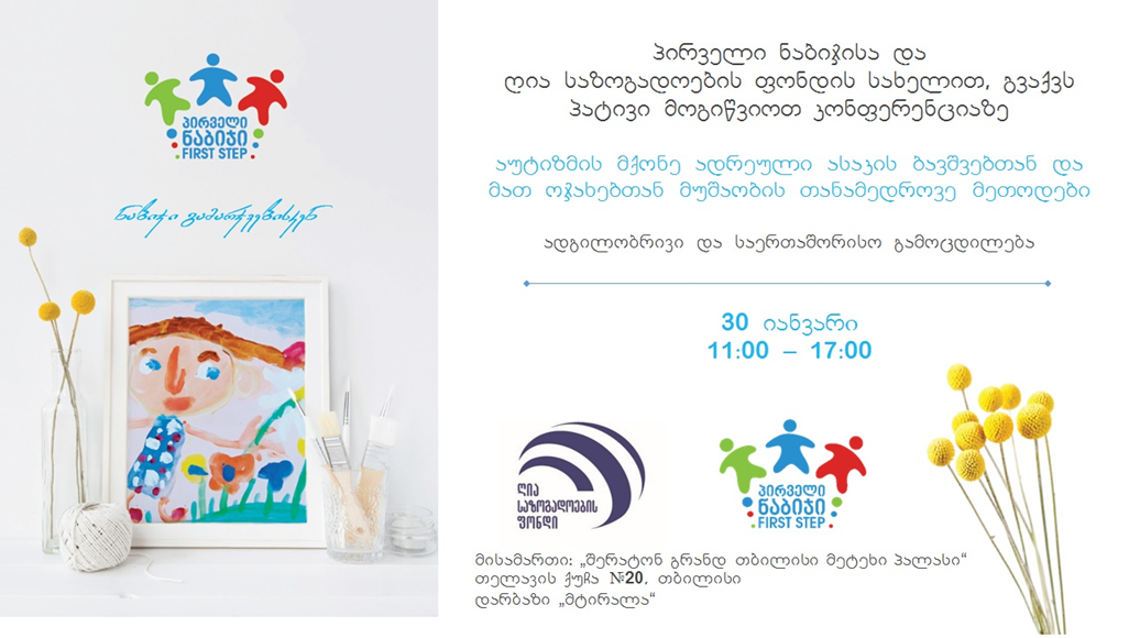 გვაქვს პატივი მოგიწვიოთ კონფერენციაზე „აუტიზმის მქონე ადრეული ასაკის ბავშვებთან და მათ ოჯახებთან მუშაობის თანამედროვე მეთოდები“, რომელიც გაიმართება პირველი ნაბიჯისა და ღია საზოგადოების ფონდის ორგანიზებით. კონფერენციის დეტალები იხილეთ მოსაწვევში.