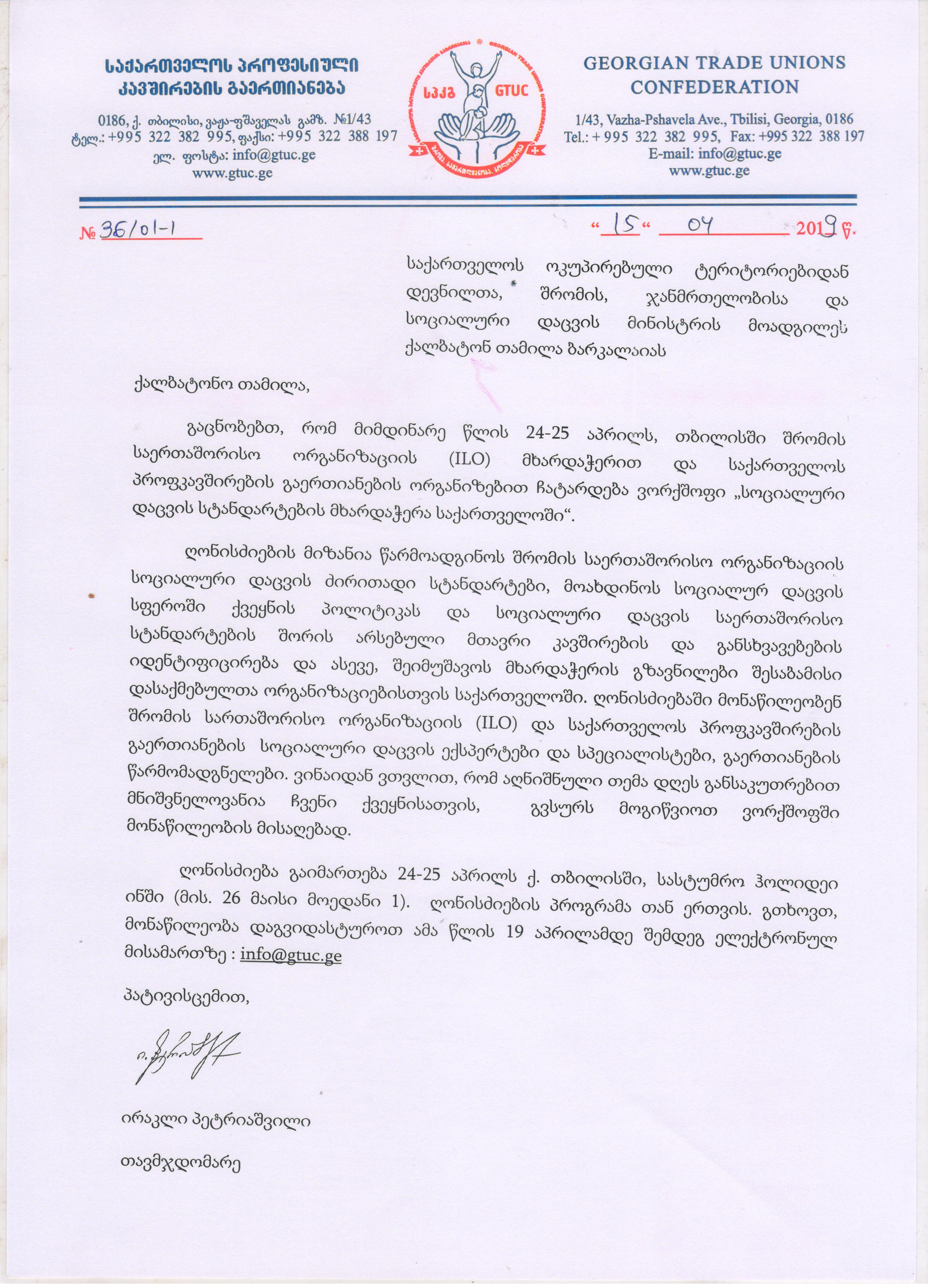 მოგესალმებით, გთხოვთ იხილოთ თანდართული მოწვევის წერილი პატივისცემით, საქართველოს პროფკავშირების გაერთიანების აპარატი