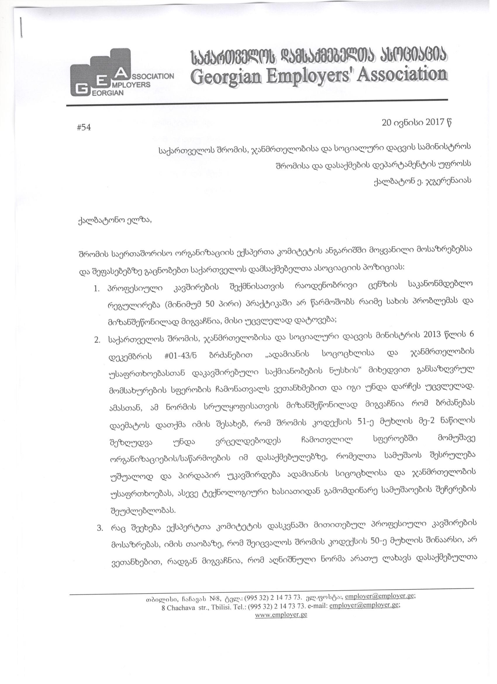 1. რეკომენდაციების შესამუშავებლად ILO-ს ექსპერტთა კომიტეტის დასკვნებზე პროფკავშირებისა და დამსაქმებელთა ასოციაციიდან მიღებულ კორესპონდენციას;