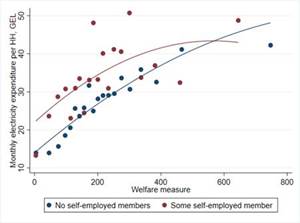 Fig 1. The correlation between residential electricity expenditure and welfare is positive but weak, it is even weaker for households where at least one member is self-employed