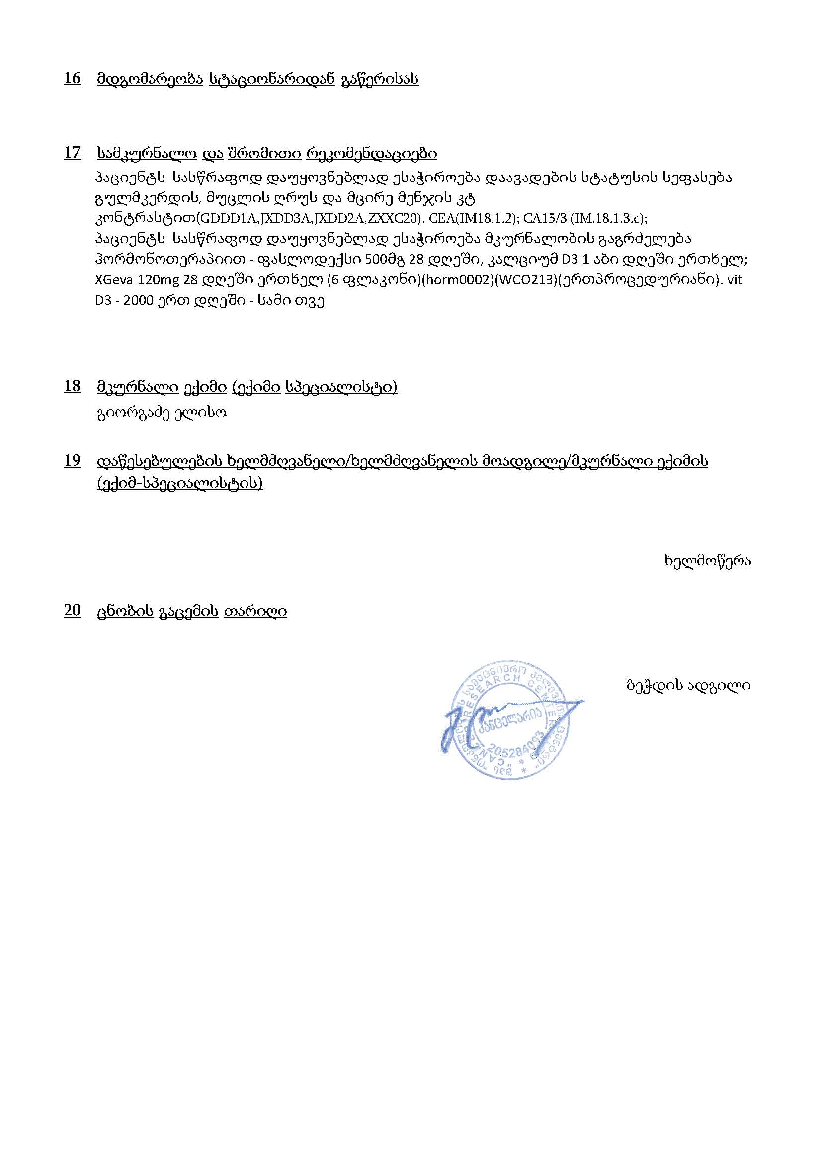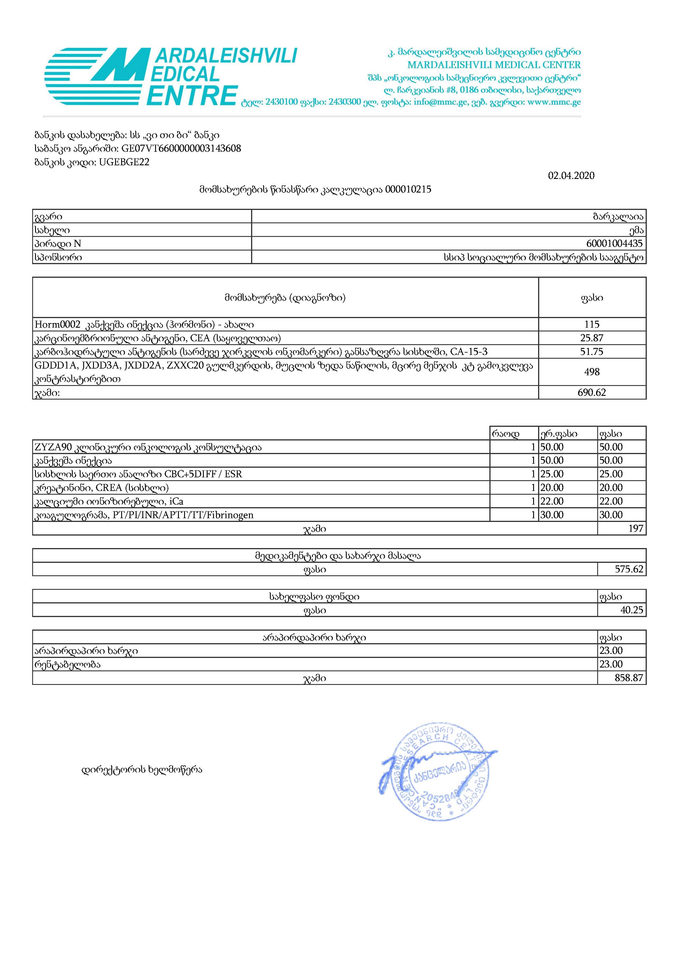 გიგზავნით პაციენტის მონაცემებს, კალკულაცია და ფორმა 100