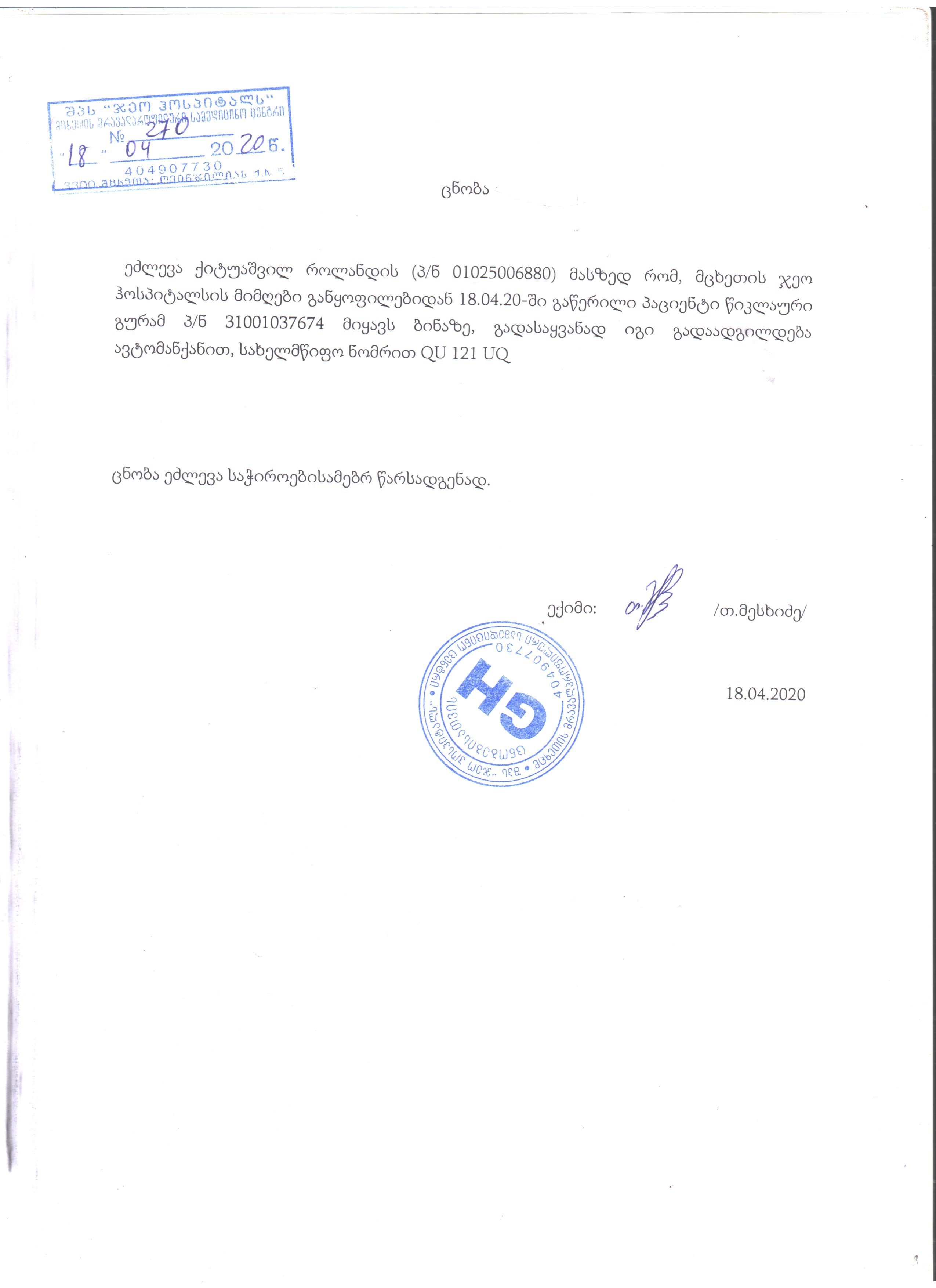 ქალბატონო თამარ გამარჯობა, დღეს მცხეთის კლინიკიდან გასაწერი იყო პაციენტი. შესაბამის პირზე - ქიტუაშვილ როლანდიზე გავეცით ცნობა (ცნობას გიფორვარდებთ). ძეგვიდან უნდა ჩამოსულიყო და წაეყვანა პაციენტი. ძეგვშივე გააჩერეს მანქანა. როგორც ბატონი როლანდი ამბობს, გააჩერა კრიმინალურმა პოლიციამ. ბატონმა როლანდიმ წარუდგინა ცნობა, თუმცა ზედაც არ დახედესო, ბაზაში არ ხარო და დააჯარიმეს. აქეთ ცალკე პაციენტი ნერვიულობს, იქეთ მისი პატრონი. როგორ მოვიქცეთ? ვინ დაგვეხმარება?