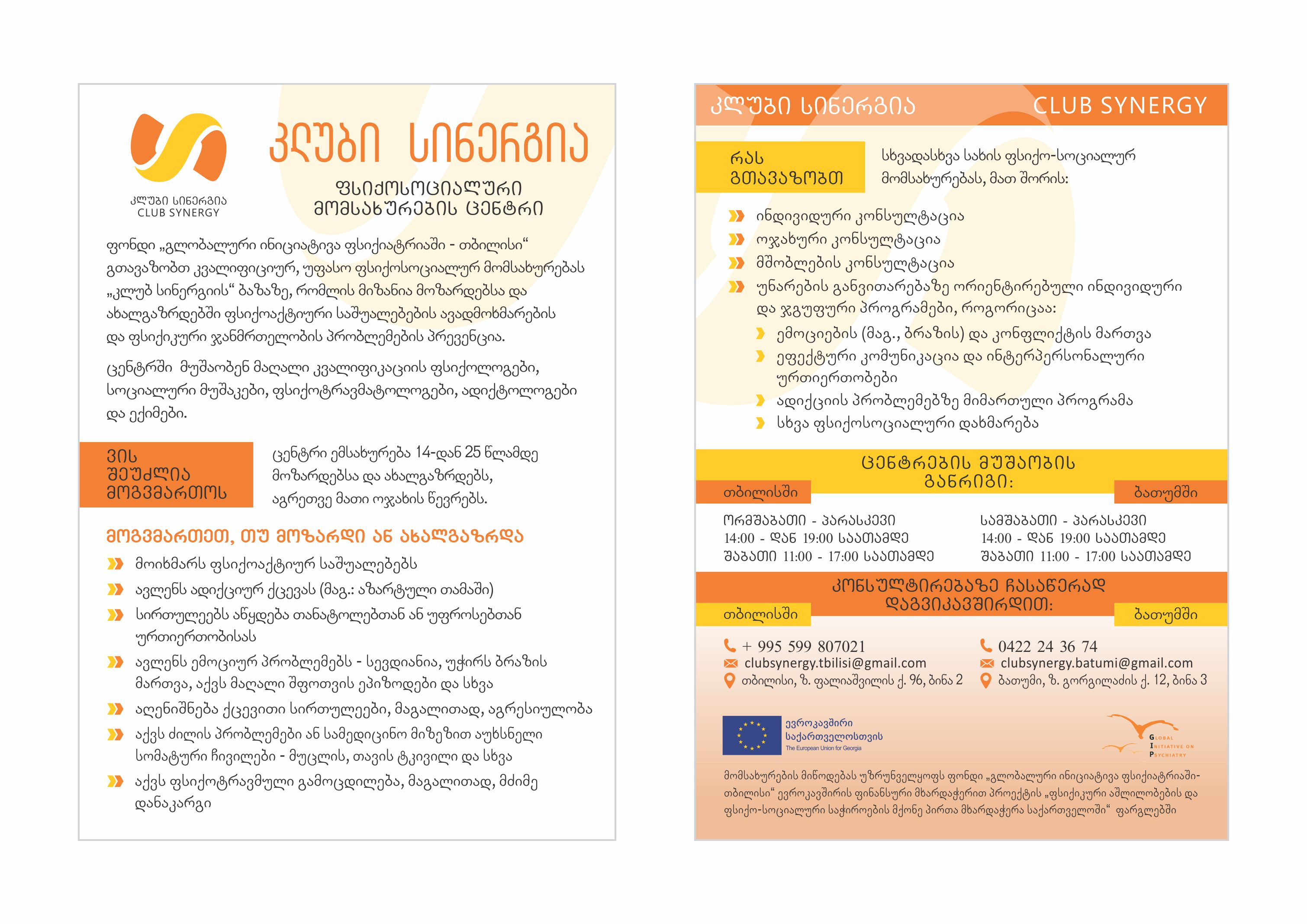 ფსიქო-სოციალური დახმარების ცენტრი „კლუბი სინერგია“, რომელიც უწევს კვალიფიციურ, უფასო მომსახურებას 14-დან 25 წლამდე მოზარდებსა და ახალგაზრდებს, აგრეთვე მათი ოჯახის წევრებს. ფსიქიკური