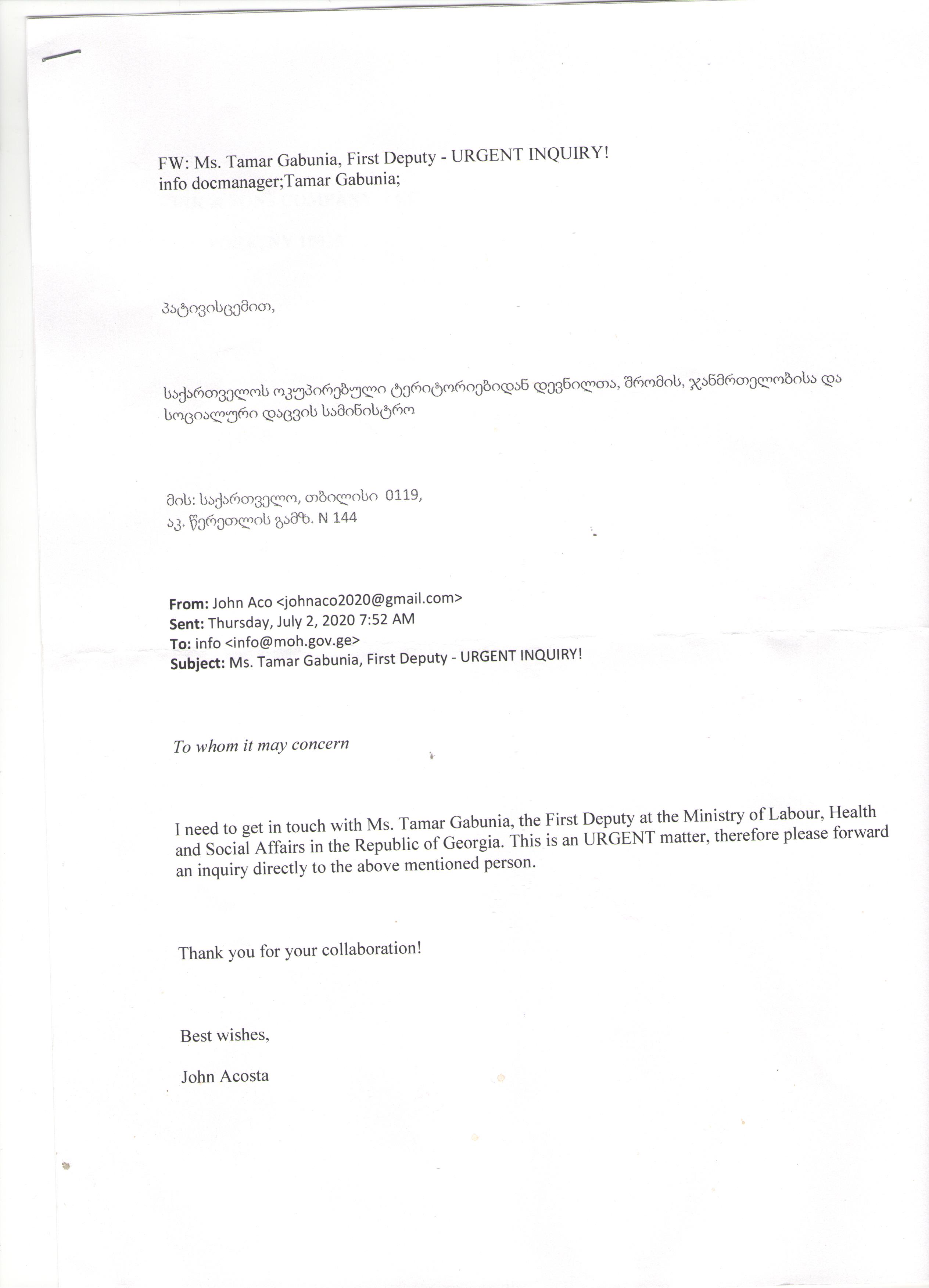 | From : | Nato Kvernadze <nkvernadze@moh.gov.ge> |