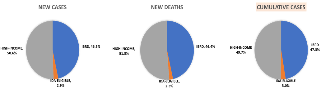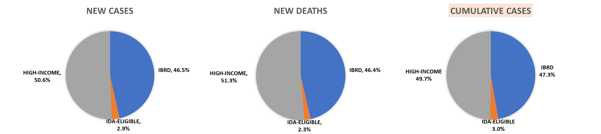 Of the total COVID-19 cases: 47.3% were reported in IBRD countries, 3.0% were reported in IDA-eligible countries, and 49.7% in High-income countries.