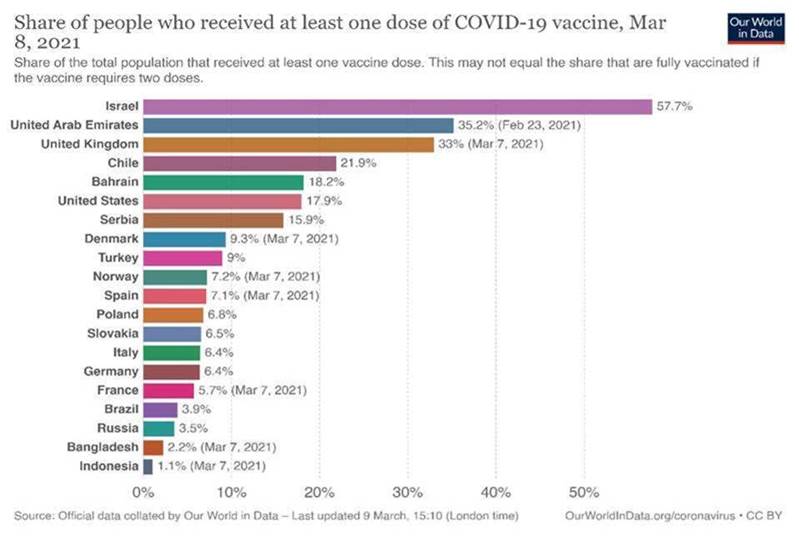 • Canada authorized Johnson & Johnson vaccine for emergency use on March 5th, becoming the first country to approve four vaccines. Canada is the third country to authorize the J&J-Janssen vaccine for public use, following Bahrain and the US, and South Africa is reportedly administering it to healthcare workers as part of a Phase 3b clinical trial. Indian vaccine shot by
