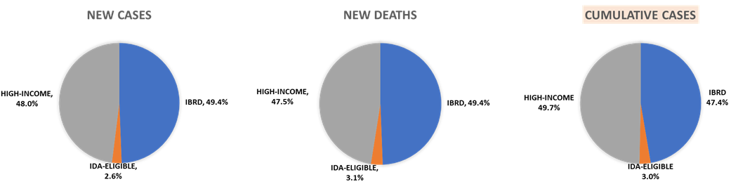 Of the total COVID-19 cases: 47.5% were reported in IBRD countries, 3.0% were reported in IDA-eligible countries, and 49.5% in High-income countries.