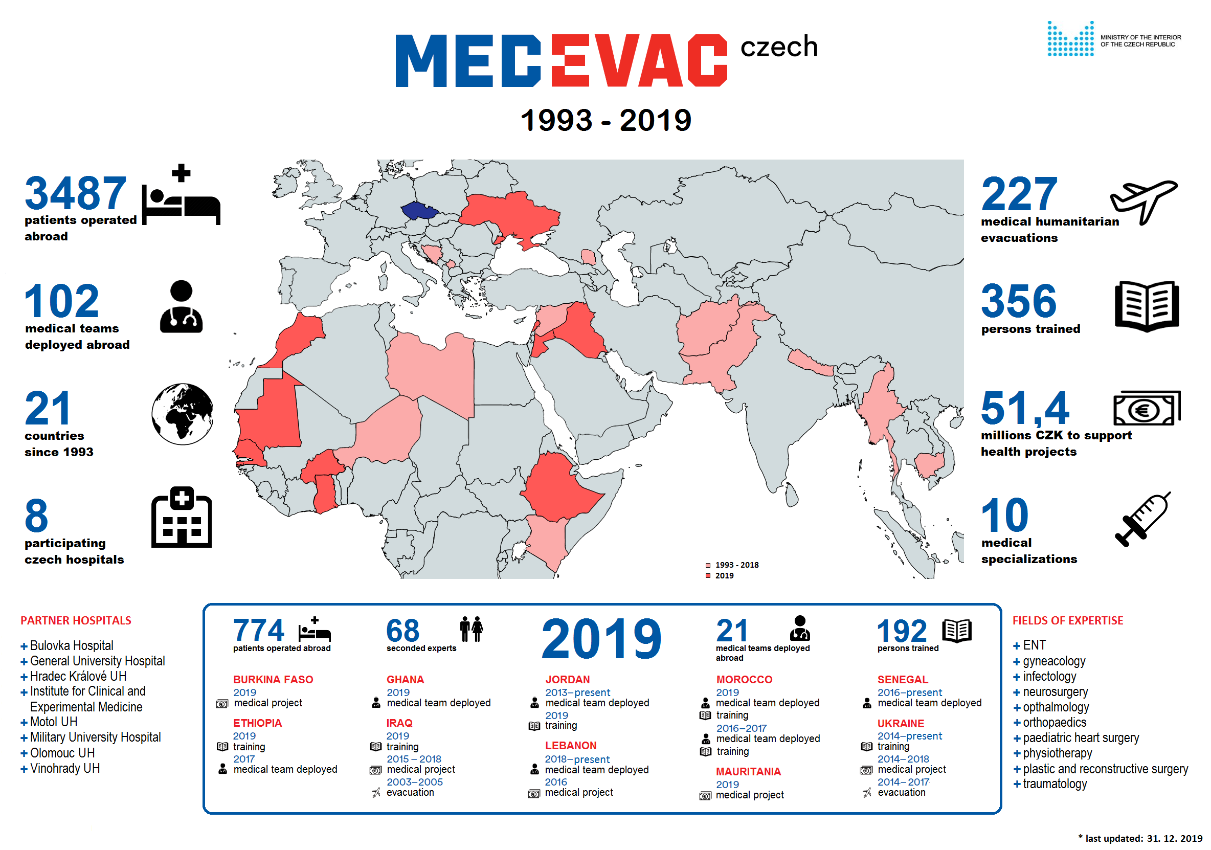 MEDEVAC is a permanent government programme of the Czech Republic, which focuses on providing medical care and assistance for vulnerable groups of persons in the countries affected by migration or burdened by a large number of refugees. The care provided is free of charge and exclusively for civilians - persons, who are in dire of such medical care or whose condition prevents them from leading a dignified life.