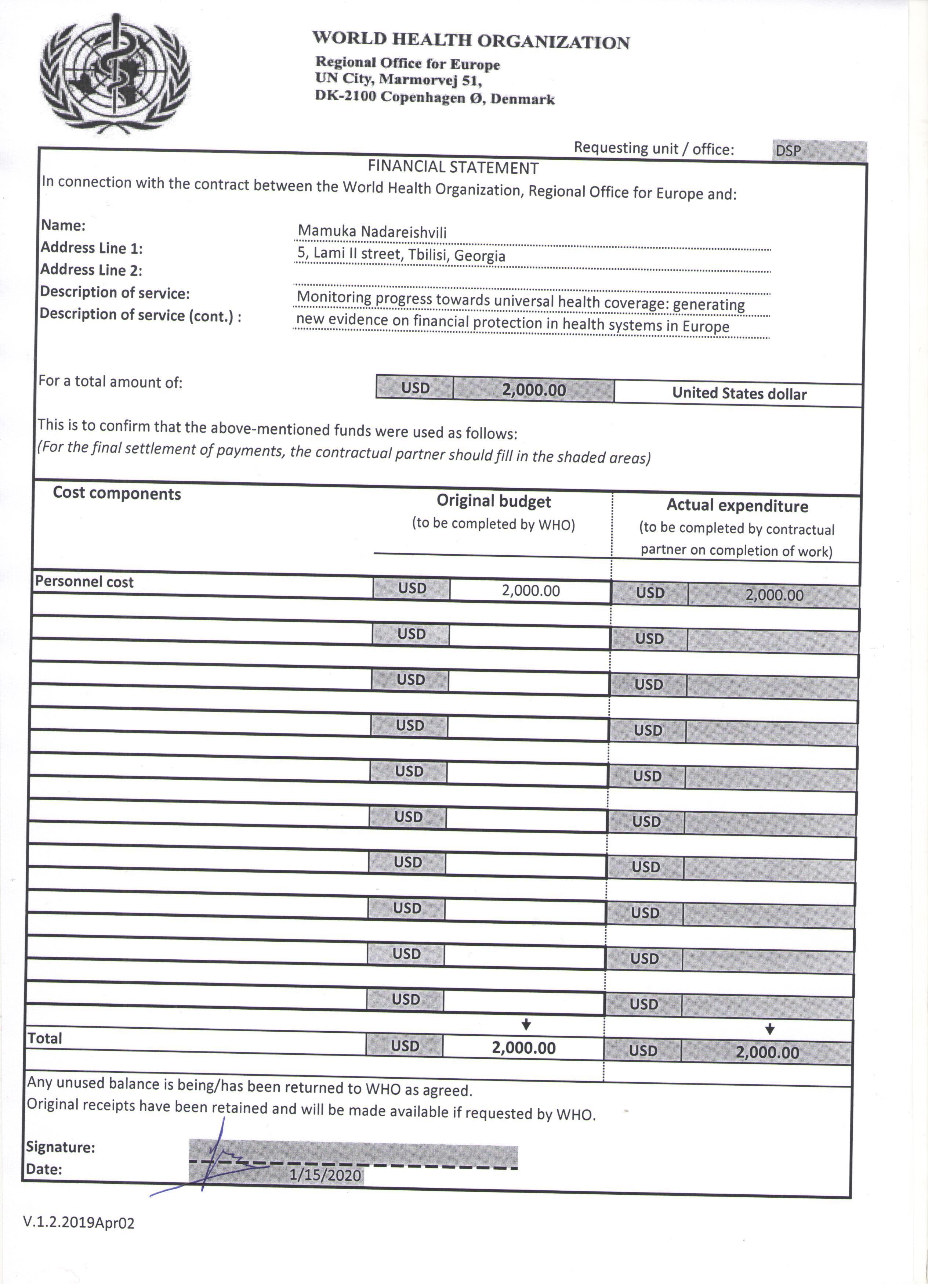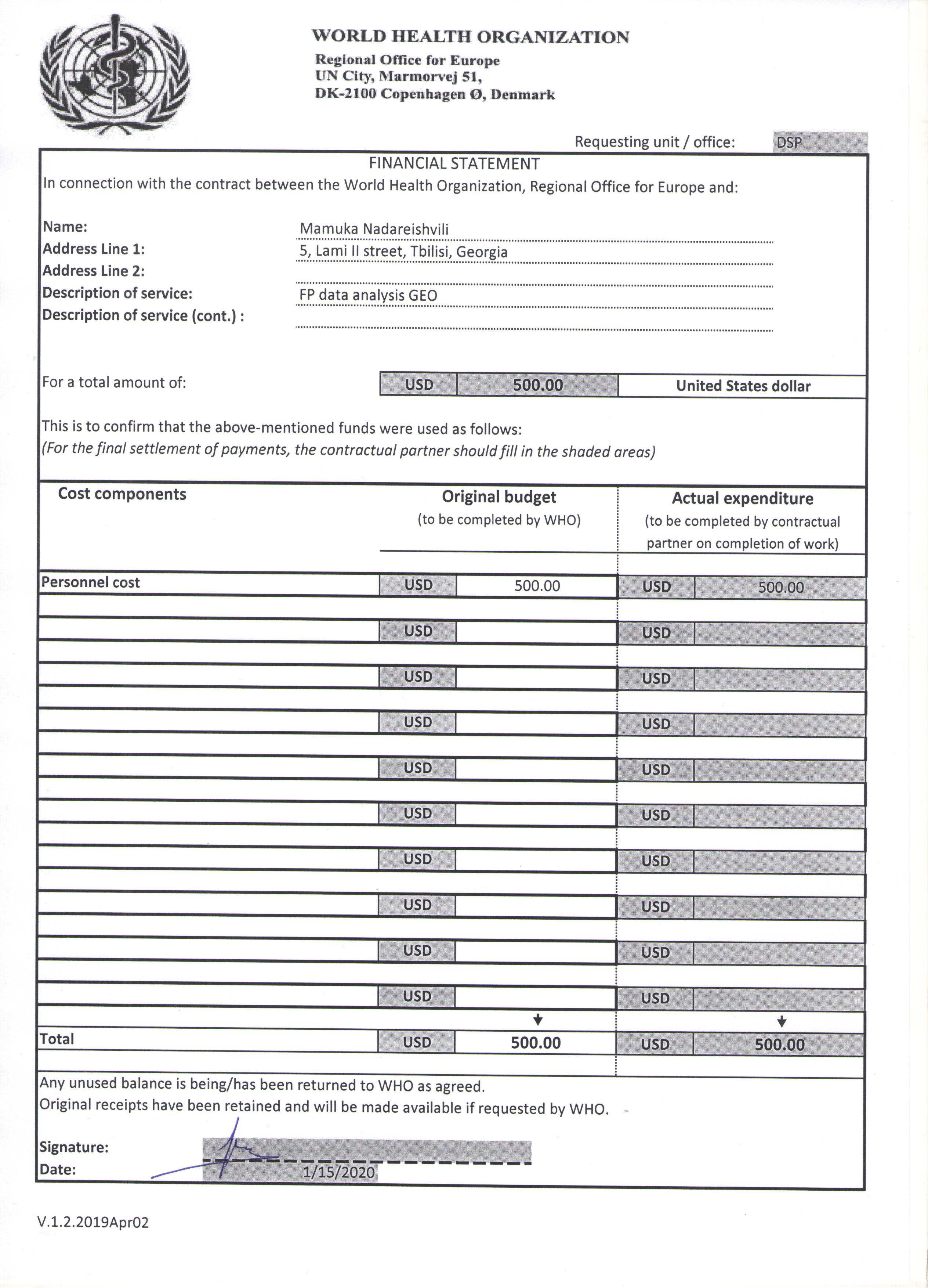 I hope you are doing well. I am bothering you regarding My and Mamuka Nadareishvilis contract reimbursement. we (me and Mamuka) did our work and sent it to Sarah in December 9. We have two contracts N202287972 and N202438466. From one we get only first installment only, from the other nothing yet. First contract finished 15.12.2019 and second 16.12.2019. Let me know, if it is possible reimbursement of the remaining amount.
