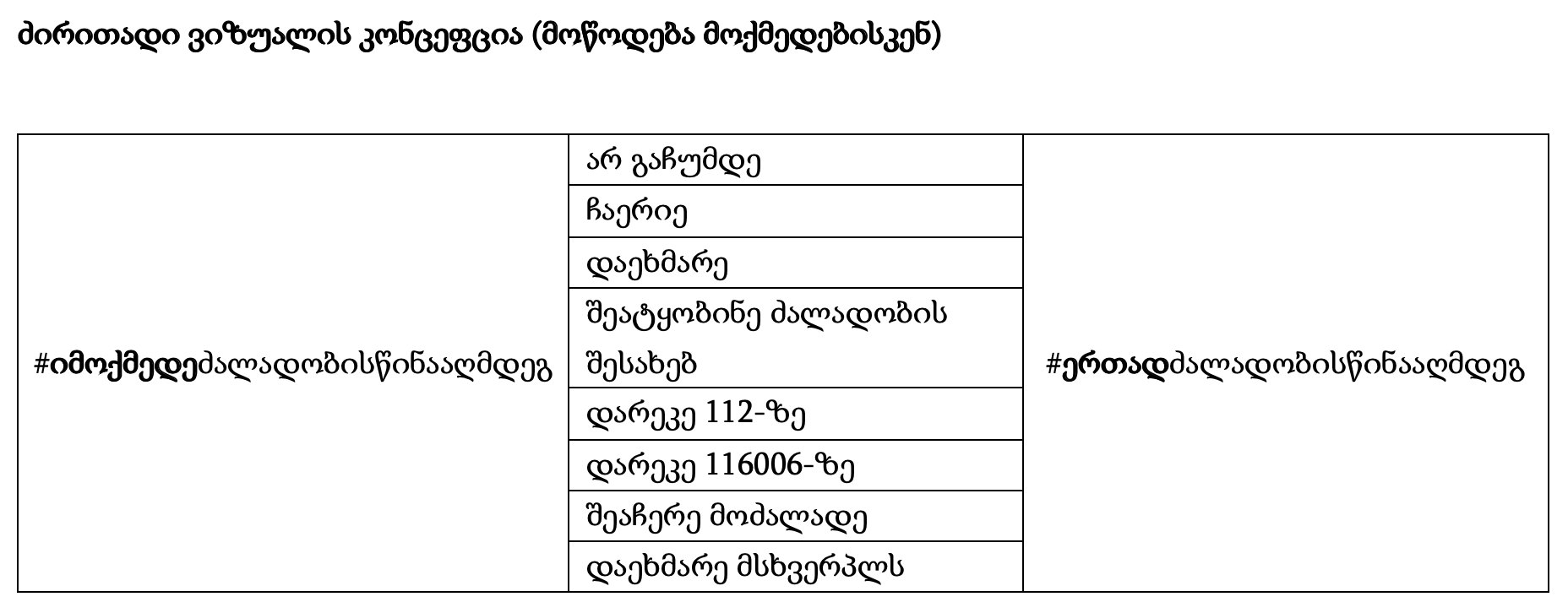 მიმაგრებულ დოკუმენტში შეგიძლიათ იხილოთ ძირითადი ვიზუალის კონცეფცია (მოწოდება მოქმედებისკენ).