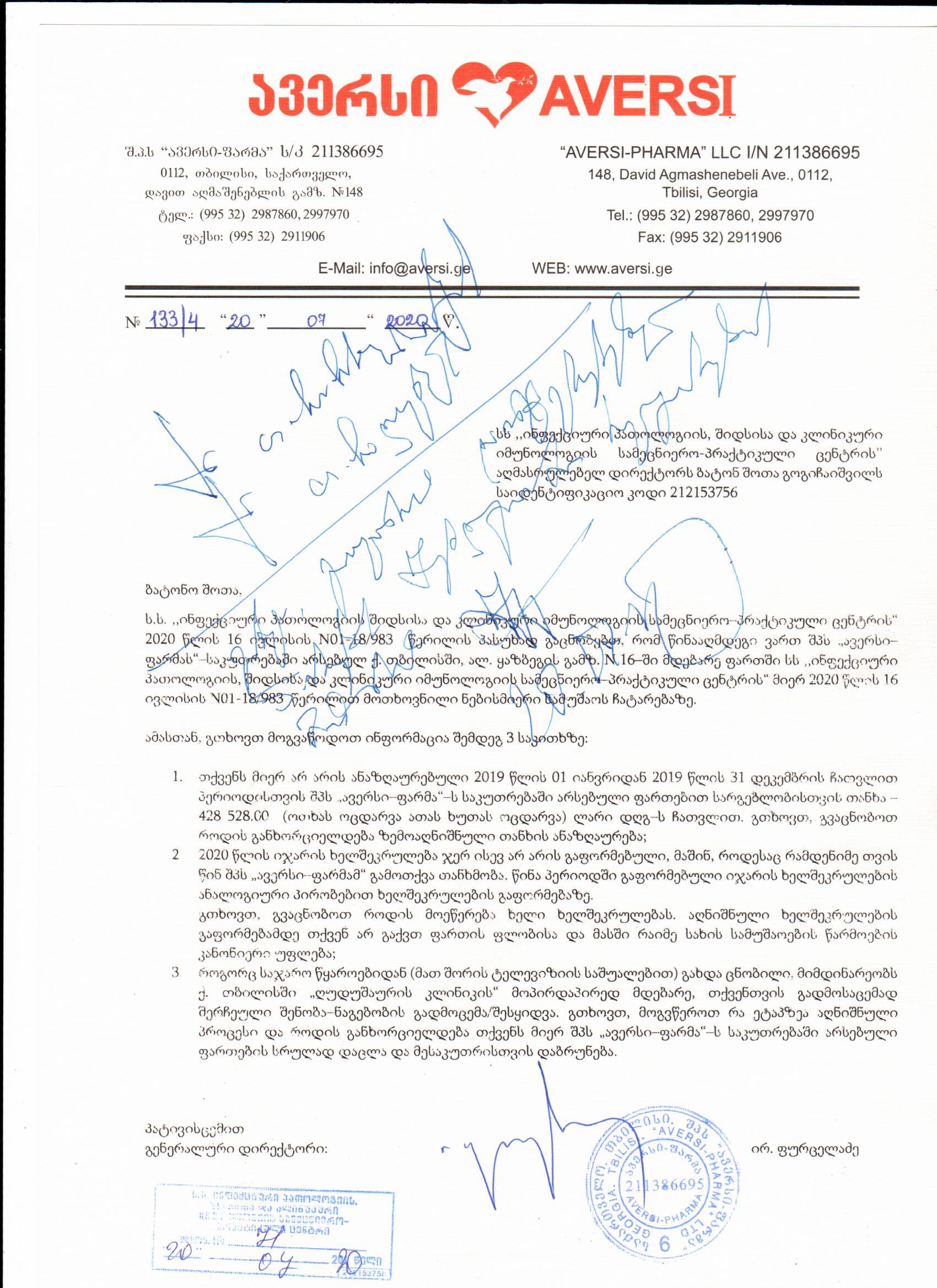 მოგახსენებთ, რომ დღეს - ა.წ. 20 ივლისს, დღის მეორე ნახევარში შპს „ავერსი-ფარმასგან“ მივიღეთ წერილი (გიგზავნით ელექტრონულ ასლს), რომელიც სამ პუნქტს შეიცავს. მოკლედ: