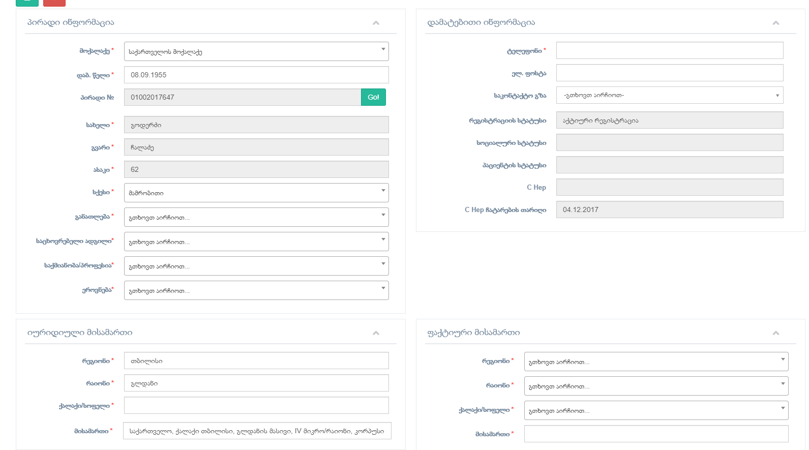 ზურა, პირადი ინფორმაციის ნაწილი არ არის სრულად შევსებული, მისამართი ადრე თბილისი ჰქონდა როგორც ჩანს, ეხლა თუ შეგიძლიათ რომ პირადი ინფოს სავალდებულო ეს ველები განახლებულად გამოუშვათ გასწორდება და კვლევებსაც დაგამატებინებთ