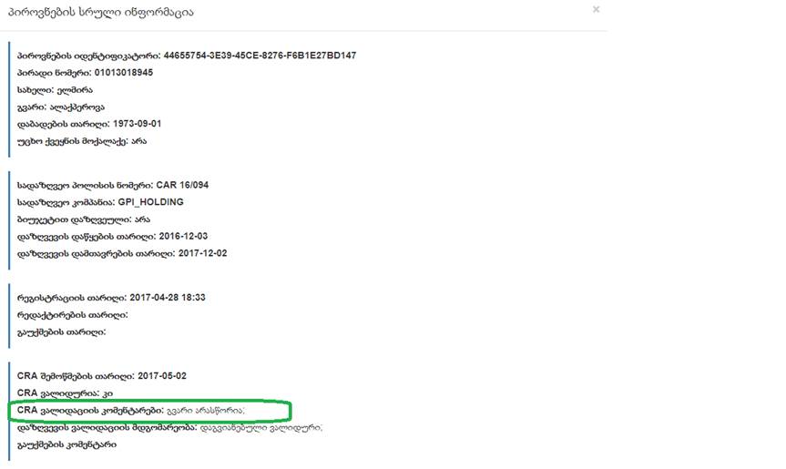 სამოქალაქო რეესტრთან ვალიდაციას გადის (როგორც თვითონ თვლიან ვალიდურად) თუ პირადი ნომერი და დაბადების წელი სწორია, ანუ, ამ შემთხვევეაში ვალიდურად ჩაითვლებოდა, მაგრამ პირველად ატვირთულში „CRA ვალიდაციის ხარვეზის“ ველში ეწერებოდა დაბ. თარიღი არასწორია.